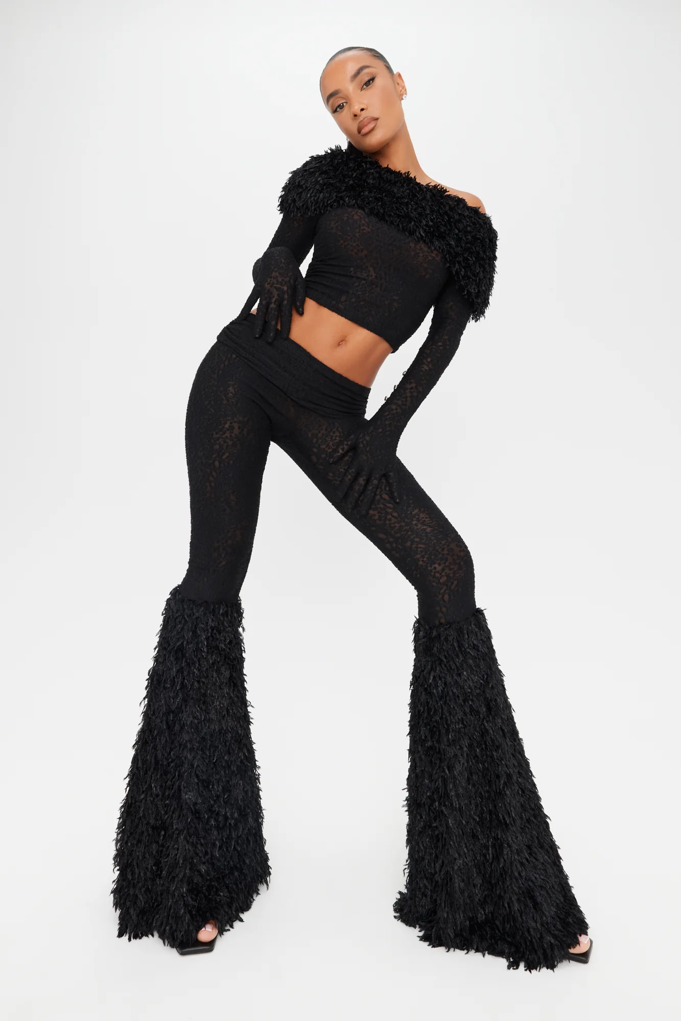 This off-the-shoulder black burnout knit top features an animal-style print and is accented with faux feather trim at the collar. The glove sleeves are finished with black crystal hardware buttons and an opening at the wrist for both style and hand access.