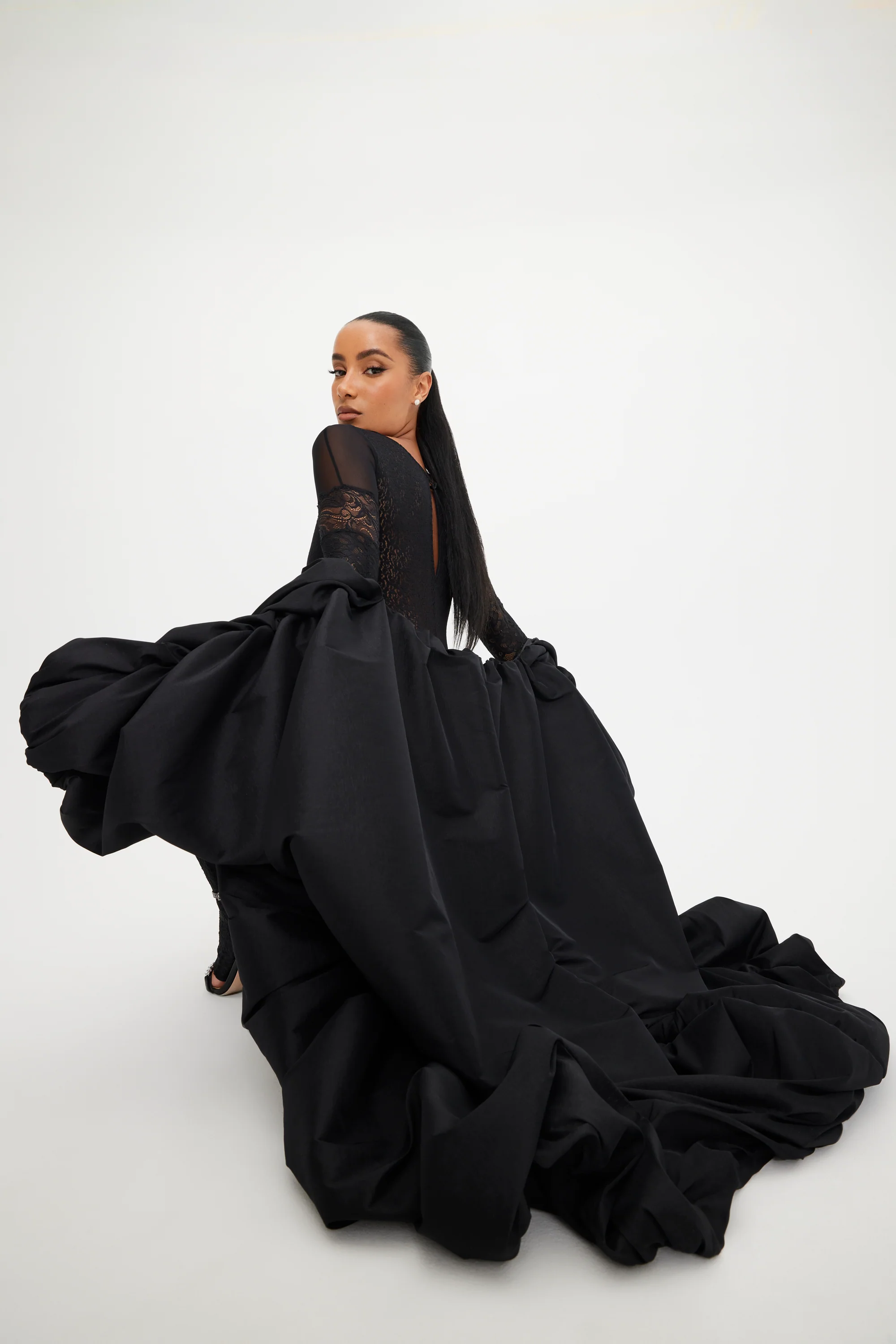 Puffy black taffeta thrown on fully lined with gathering detail at sleeves, cuff, neck line, opening and back center to create a puffy effect. Knee length and long sleeves.