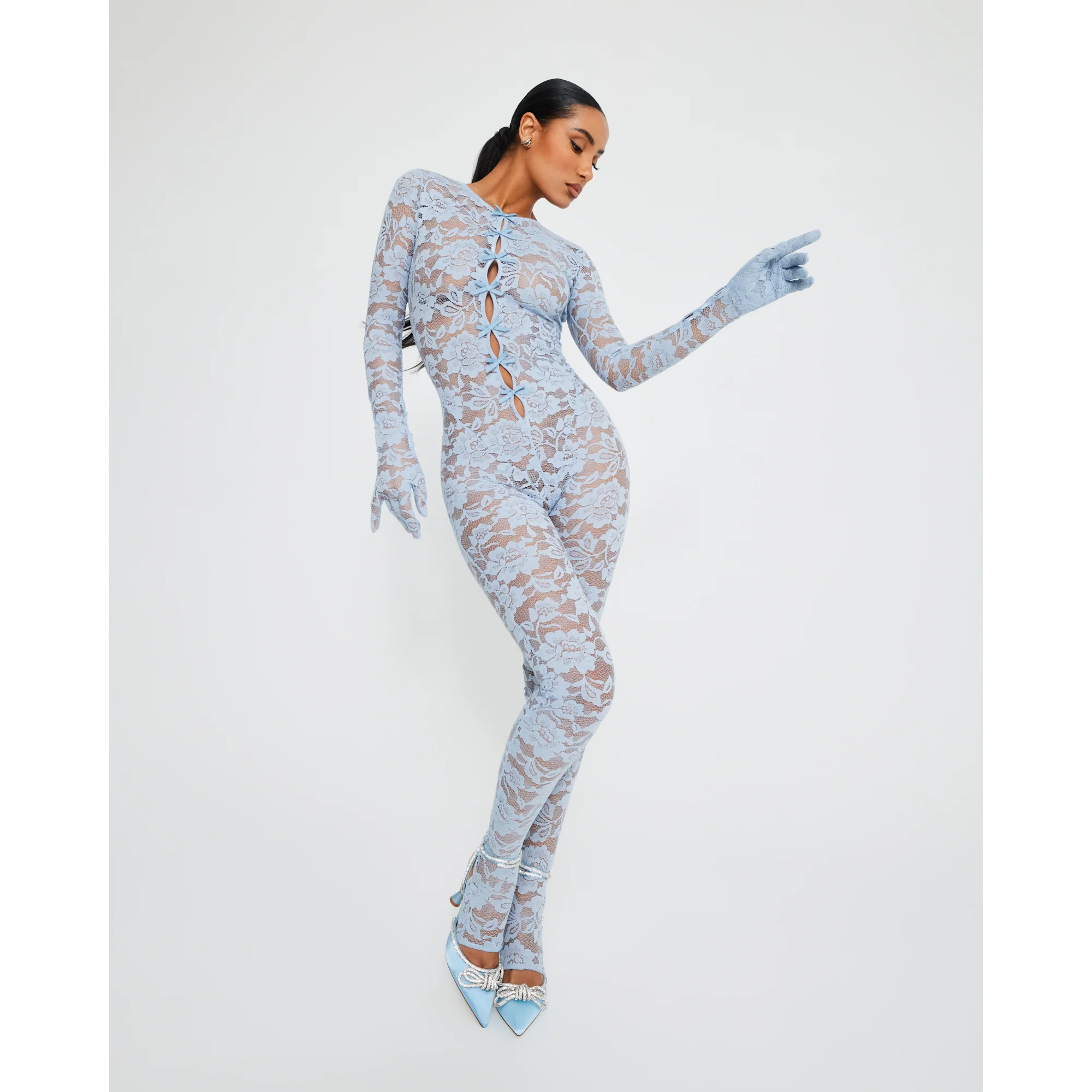 Unlined Powder blue gloved sleeves lace catsuit with bow detailing at front. The glove portion at wrist has a button with loop opening to allow for the use of bare hands. Heel and toe opening and keyhole at back.