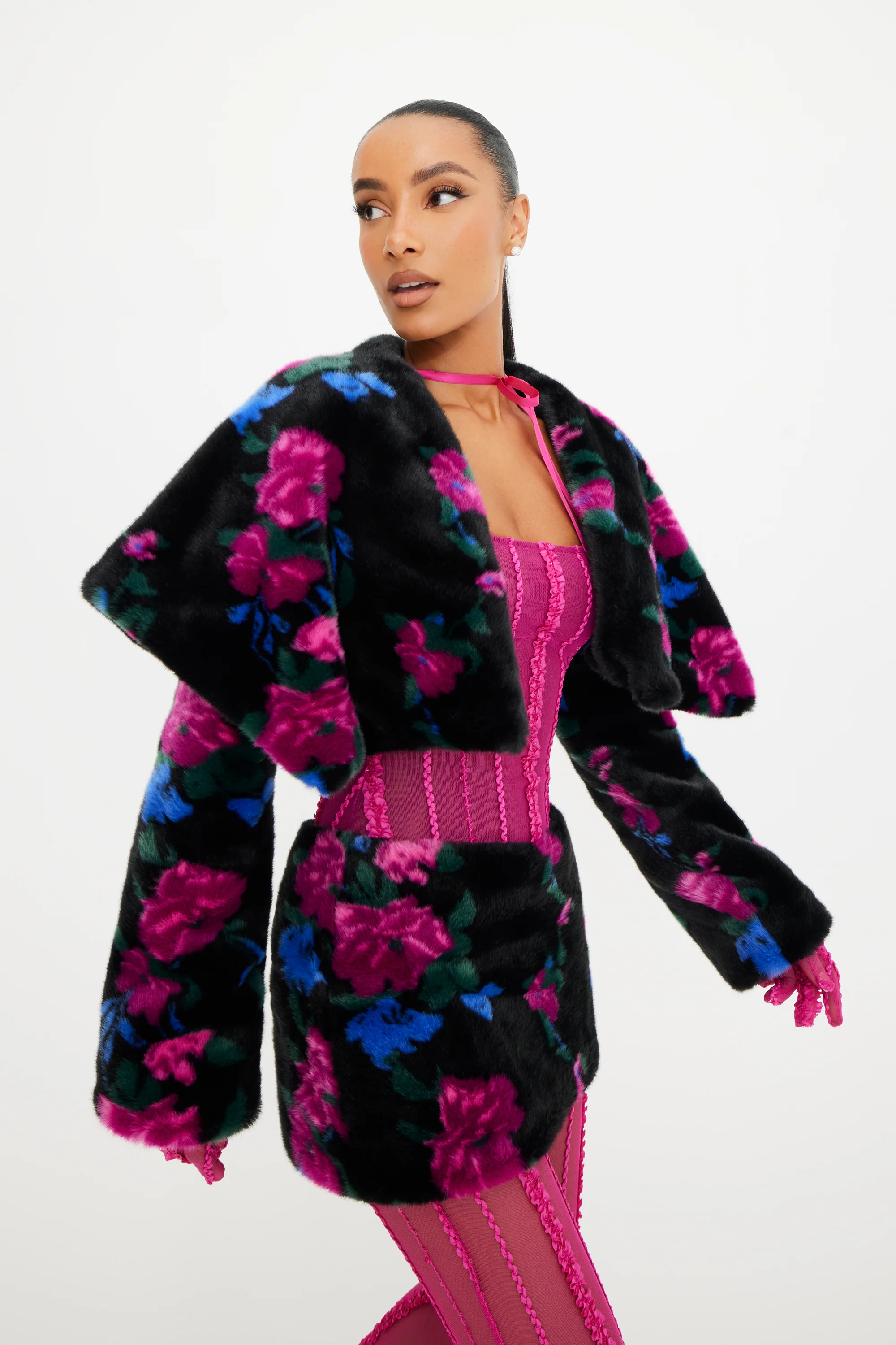 Fully satin lined black jacquard pink flower design faux fur mini skirt with center back insensible zipper.
