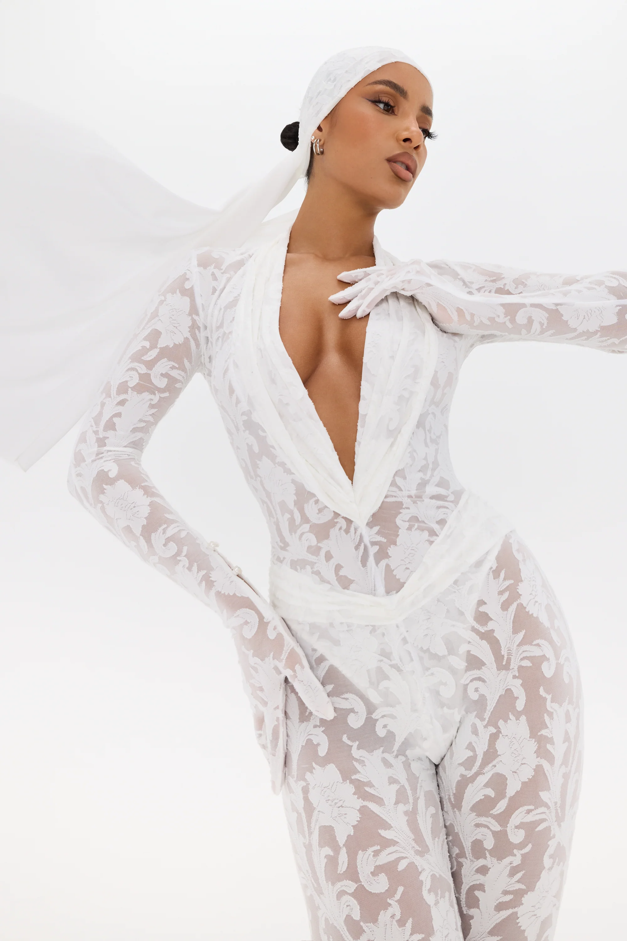 Timeless elegance meets modern allure in the Hepburn Bodysuit, crafted from ivory burn-out knit lace with an intricate floral design. A draped plunging neckline with soft pleating evokes vintage sophistication, while the high-thigh cut elongates the legs for a statuesque silhouette. The sleek cheeky back ensures a seamless fit, and white crystal flower buttons & loops at the wrists add a refined touch. Finished with a hidden back zipper for effortless wear, this piece embodies the grace and sophistication of old Hollywood with a Riviera twist.