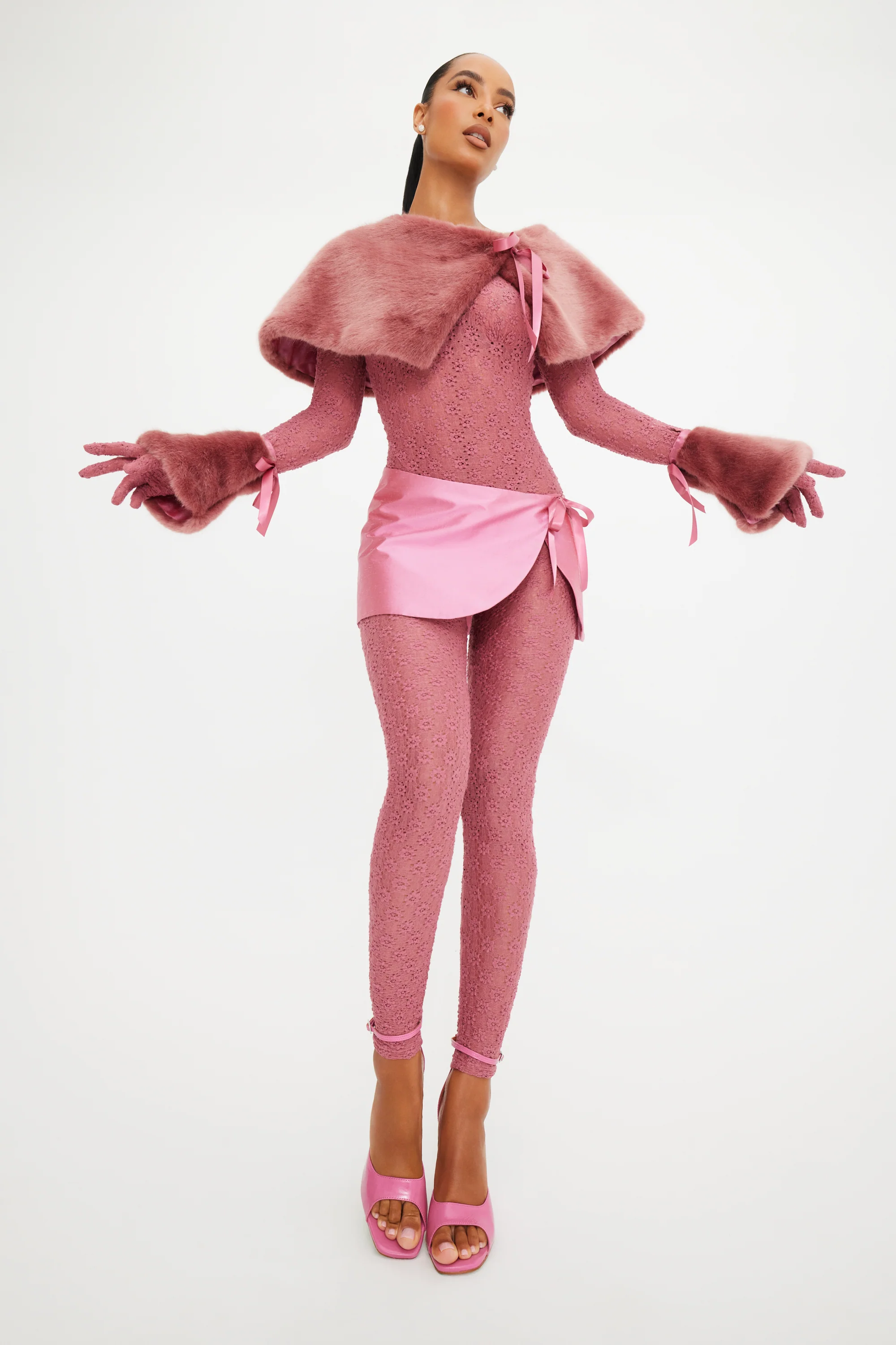 Unlined Raspberry mousse gloved sleeve popcorn textured lace catsuit. With open neck and ribbon closure system and keyhole at back.