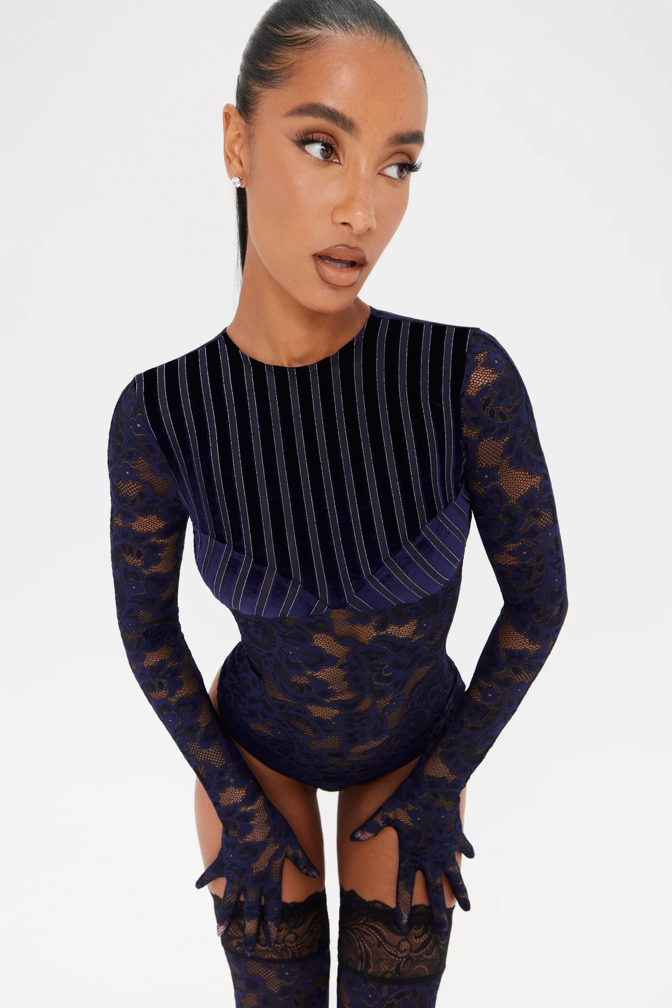 This exquisite bodysuit features a stunning midnight blue and black 2-tone lace, complemented by a midnight blue velvet stripe fabric with metallic accents at the bust and yoke area, creating elegant cup silhouette lines. The design is finished with an invisible back zipper and a keyhole detail for a refined, polished look. The thong back offers a sleek fit, while the glove sleeves, complete with button loops at the wrists, provide both style and convenience.